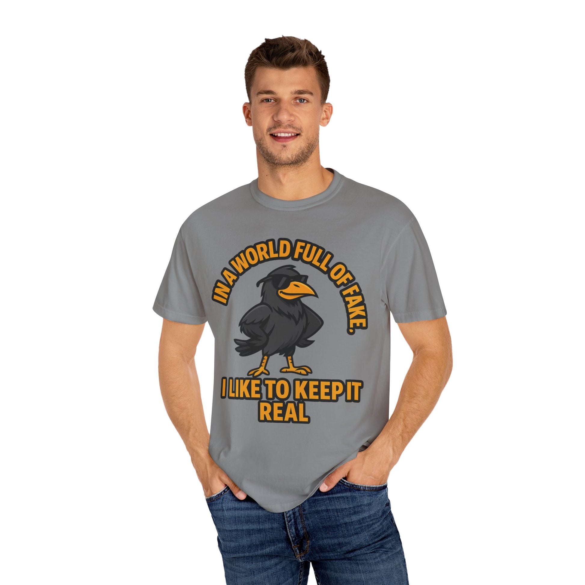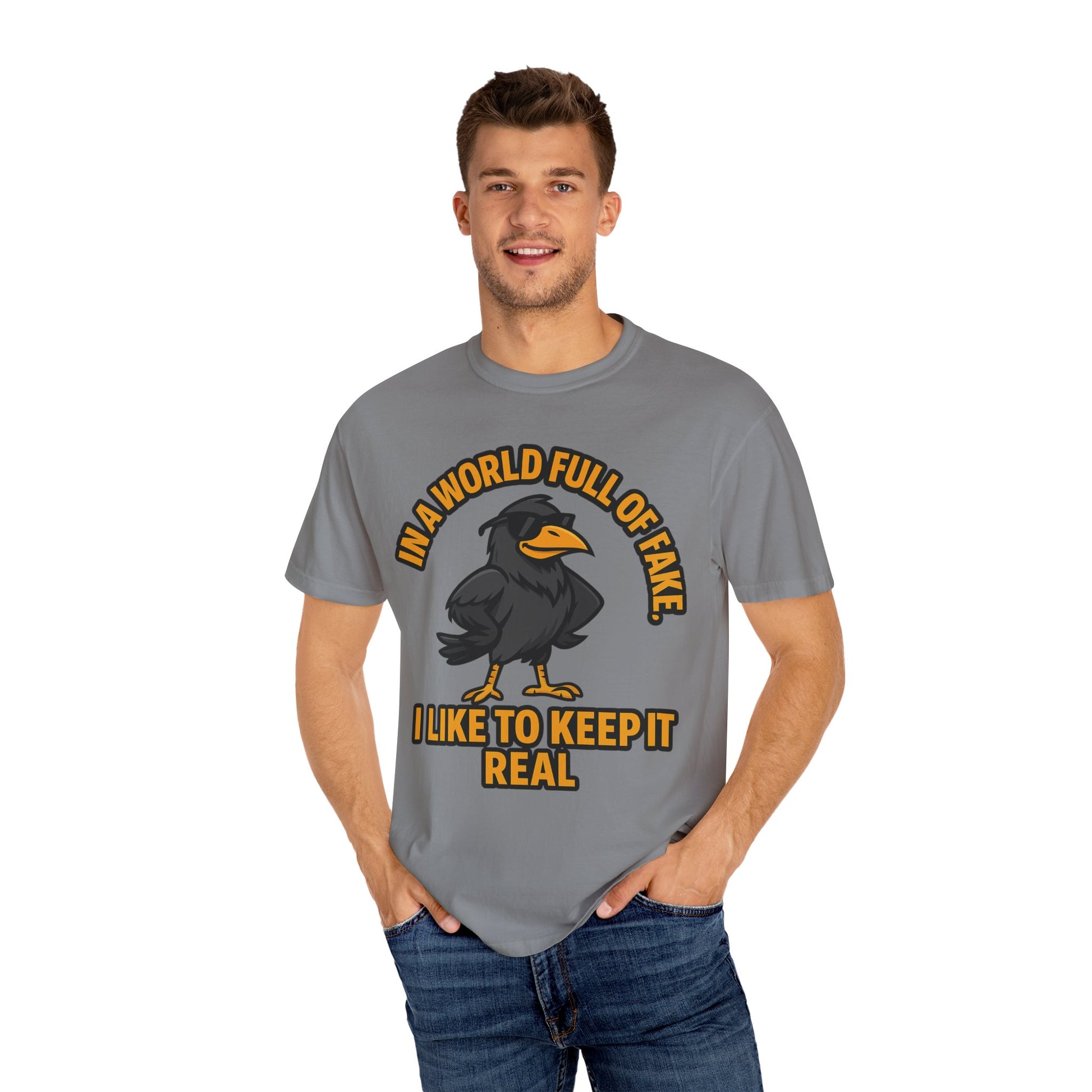 This relaxed garment-dyed tee carries a playful, honest spirit. A bold crow illustration stands front-and-center beneath the phrase “In a world full of fake, I like to keep it real,” giving the shirt personality without shouting. The midweight, 100% ring-spun cotton feels broken-in from the first wear thanks to post-construction dyeing, and the tubular knit and double-needle stitching mean it wears well through many washes. It’s the kind of everyday shirt you reach for when you want to quietly announce you value authenticity — great for casual coffee runs, low-key meetups, or wearing while working on creative projects at home.